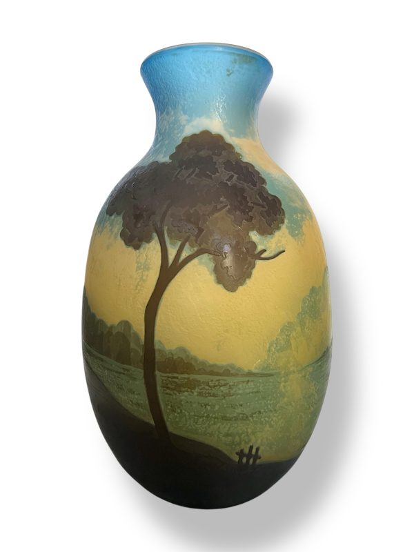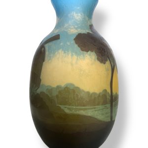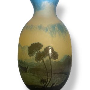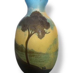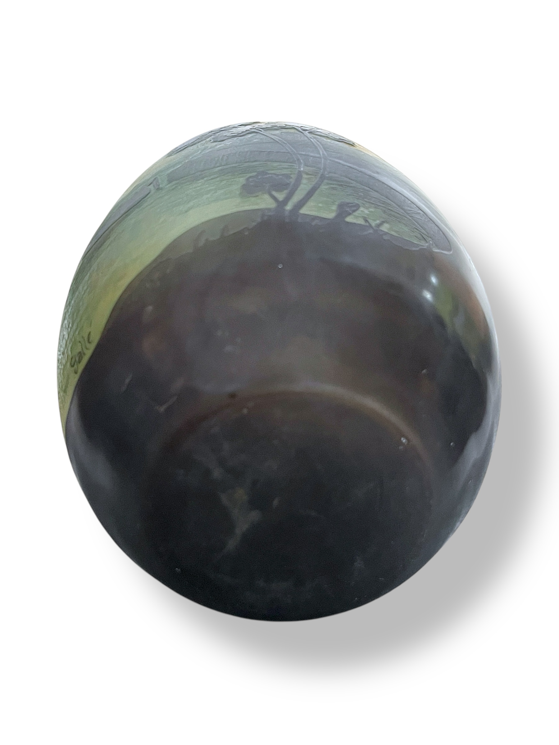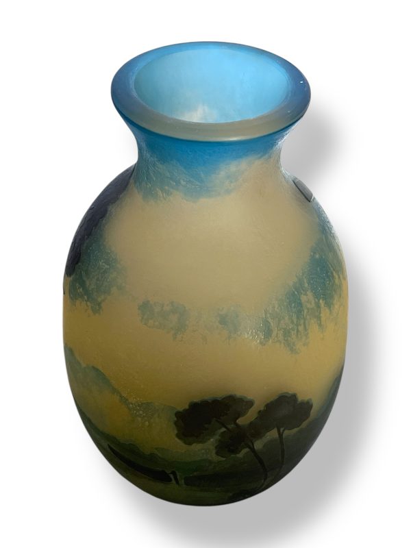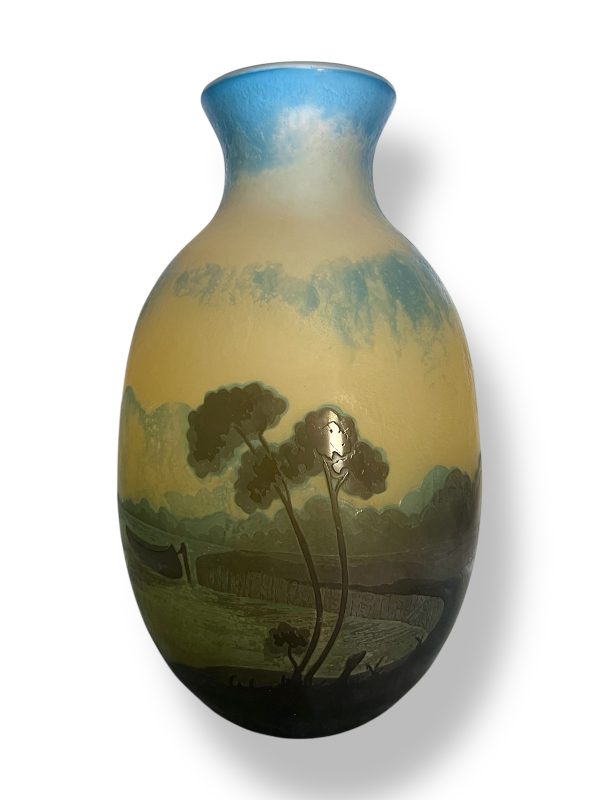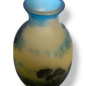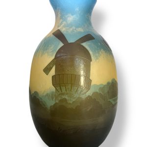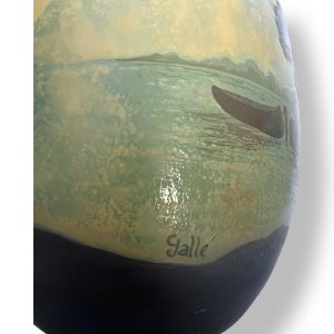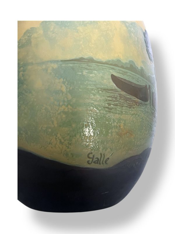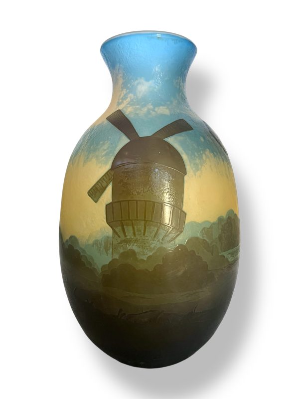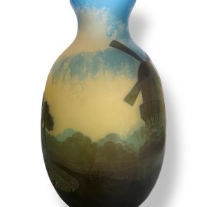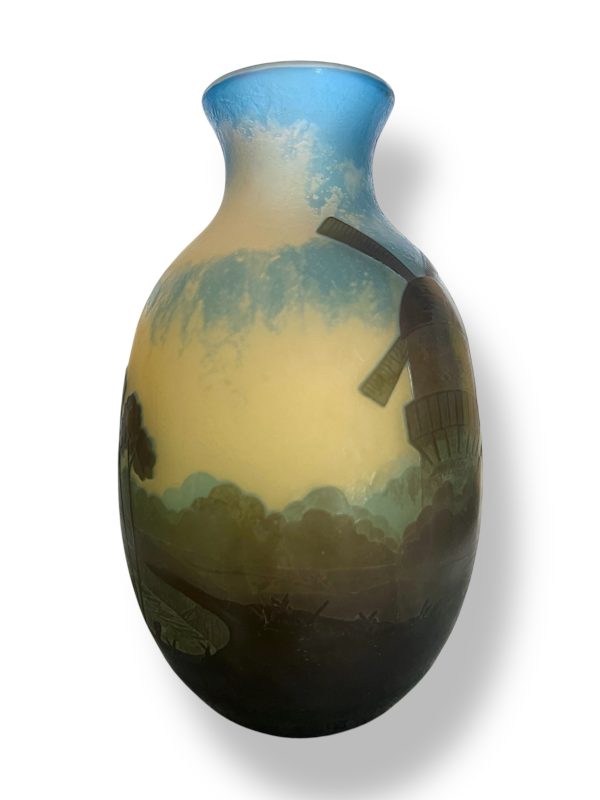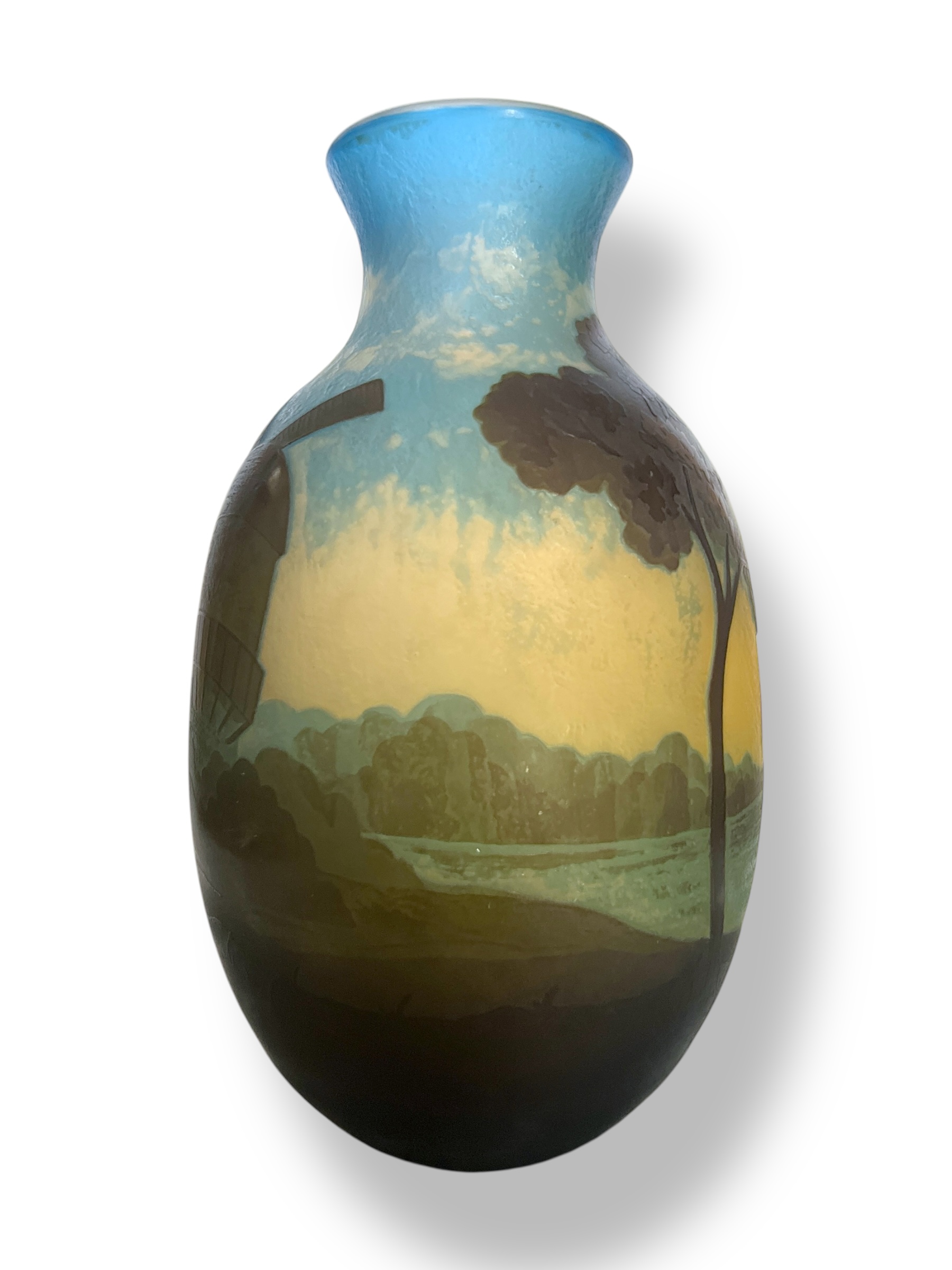 Emile GALLE (1846-1904). Vase représentant un moulin sur fond de paysage lacustre. Signature de Gallé dans le bas du vase. Vers 1910