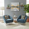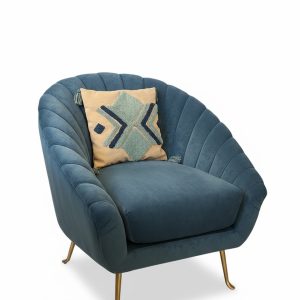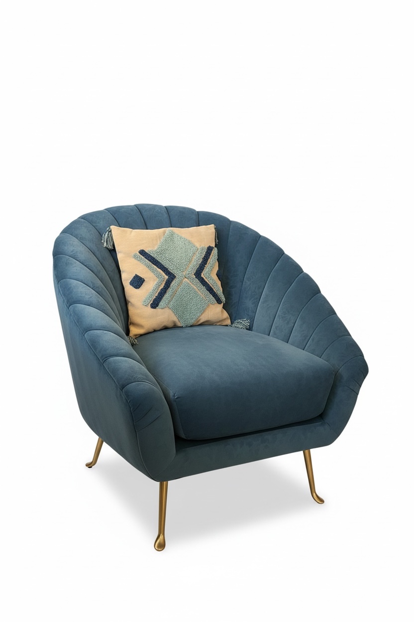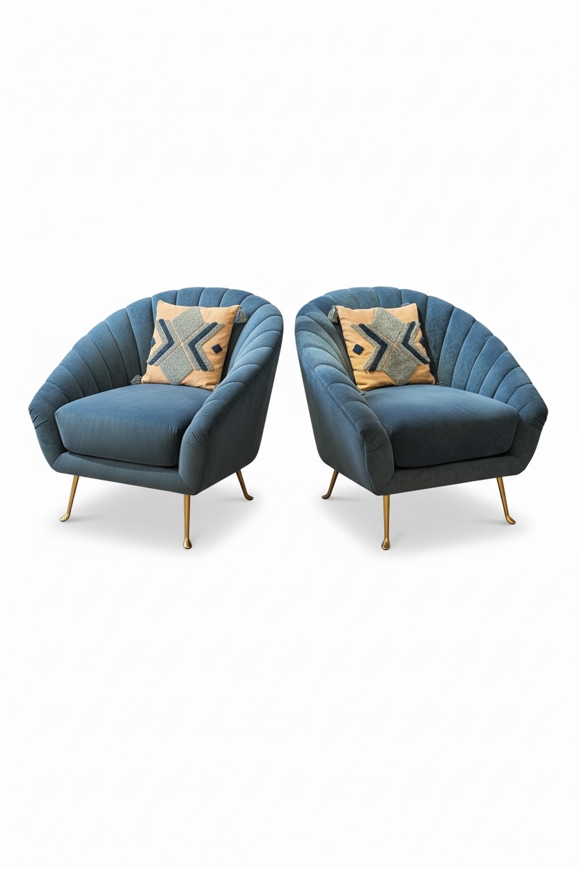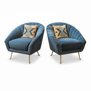 Paire de fauteuils en forme de coquillage et en velours bleu.