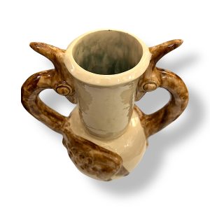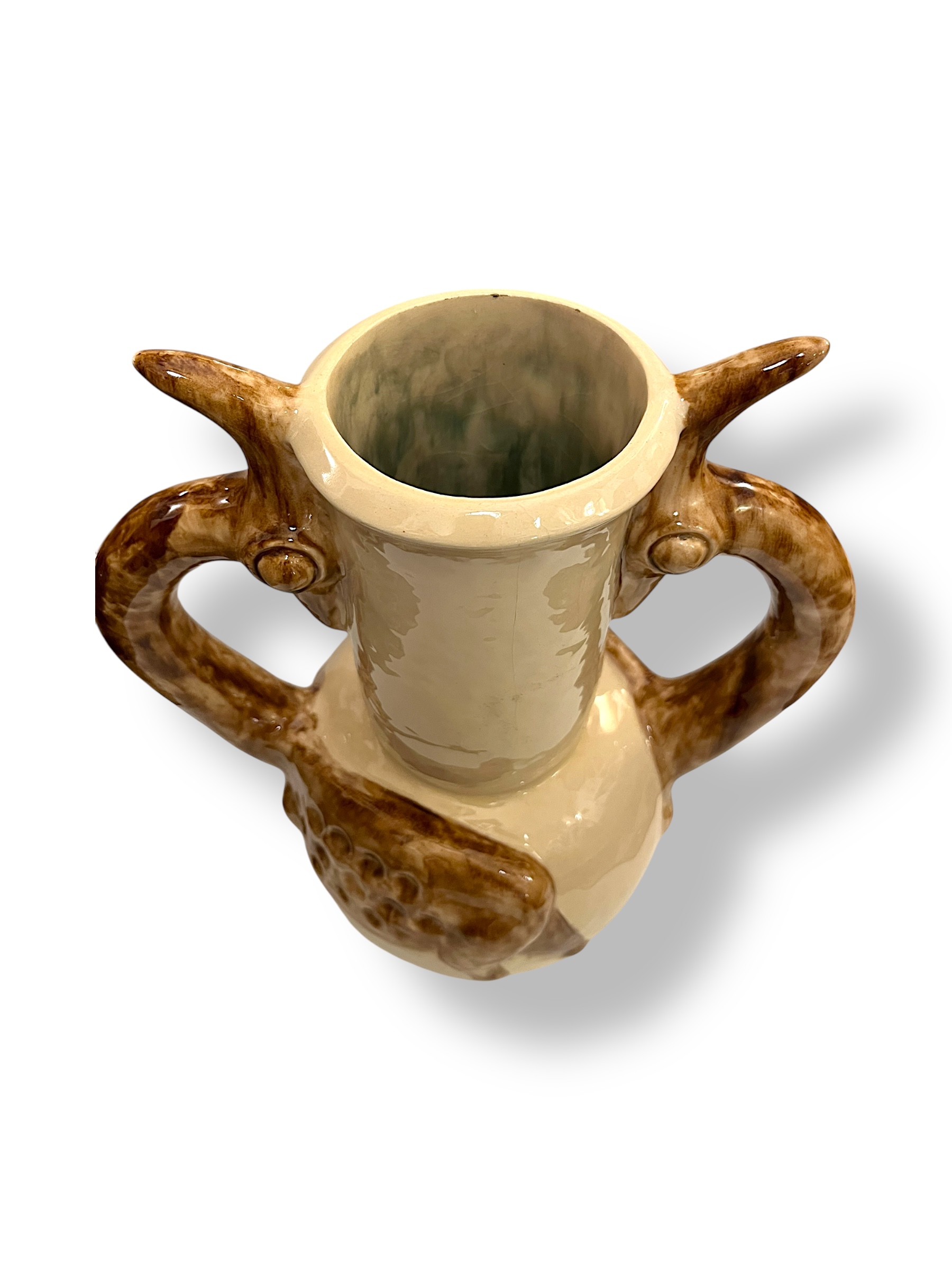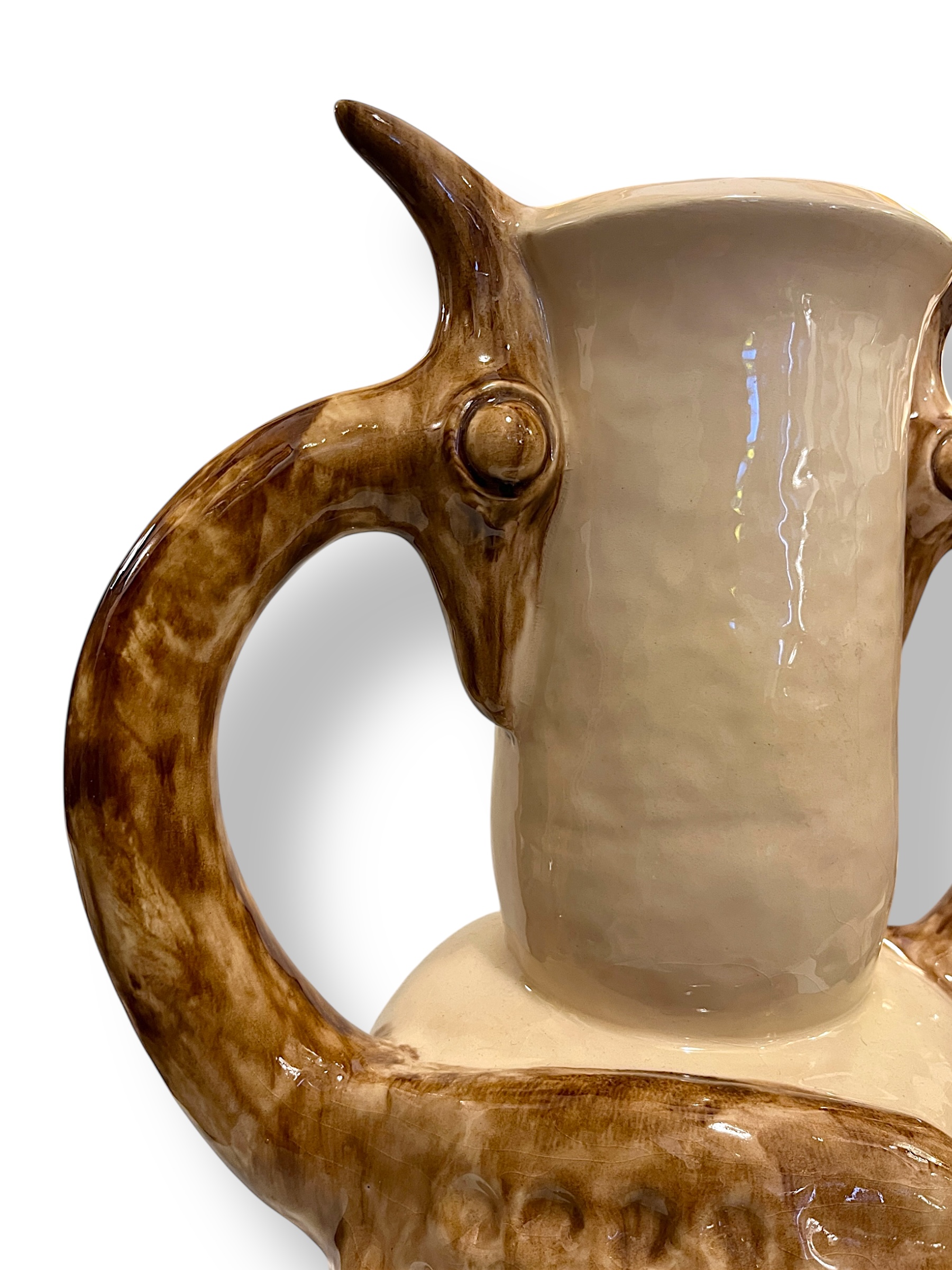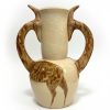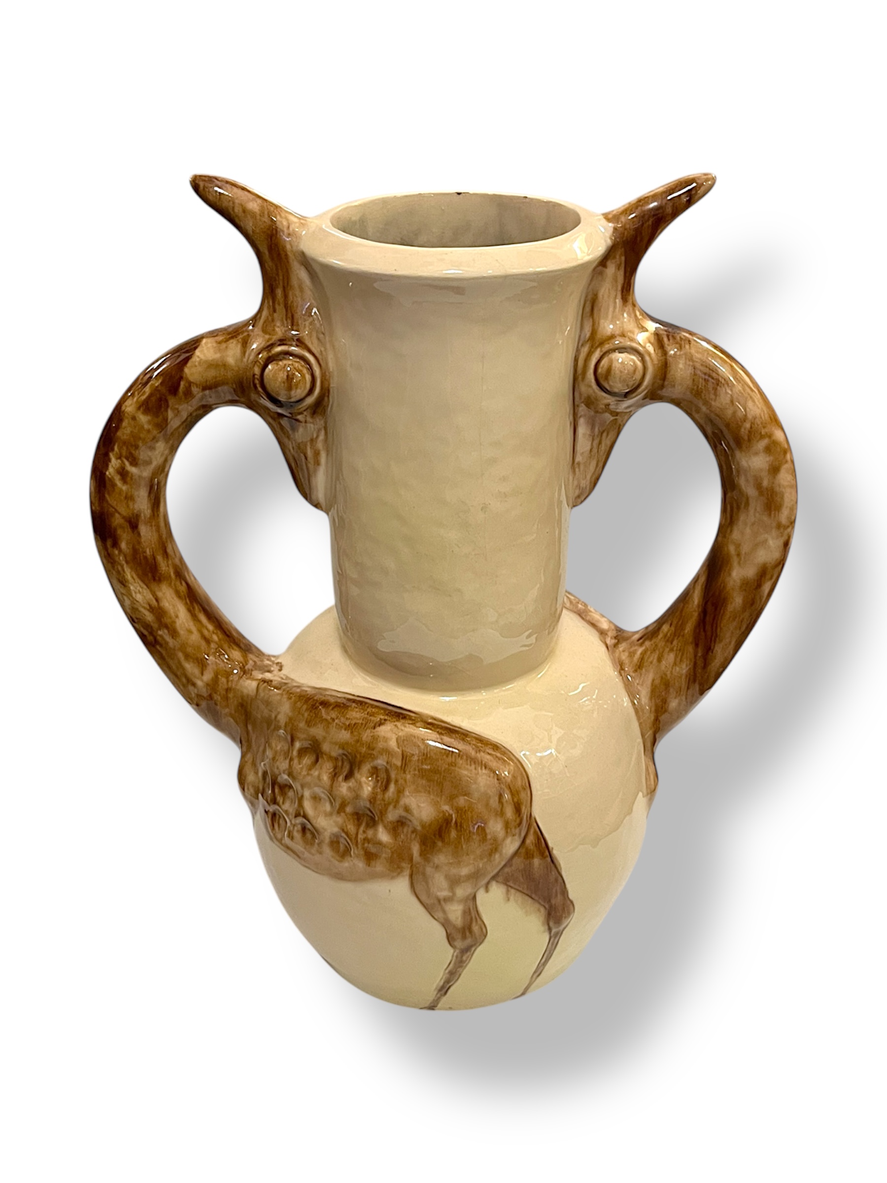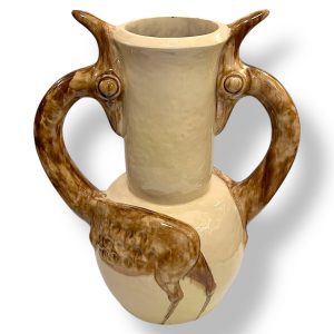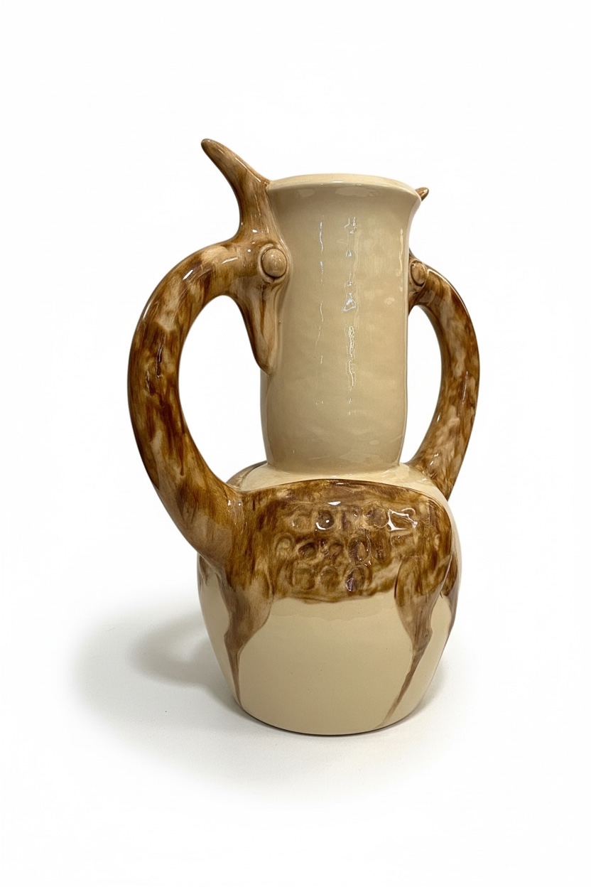 Vase en céramique émaillée beige, et marron, à haut col cylindrique, les anses figurant deux bouquetins par Huybrechts, Belgique, vers 1950.
