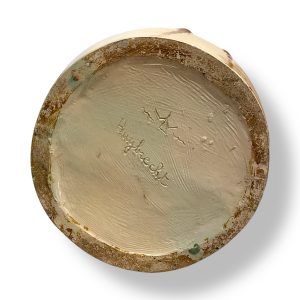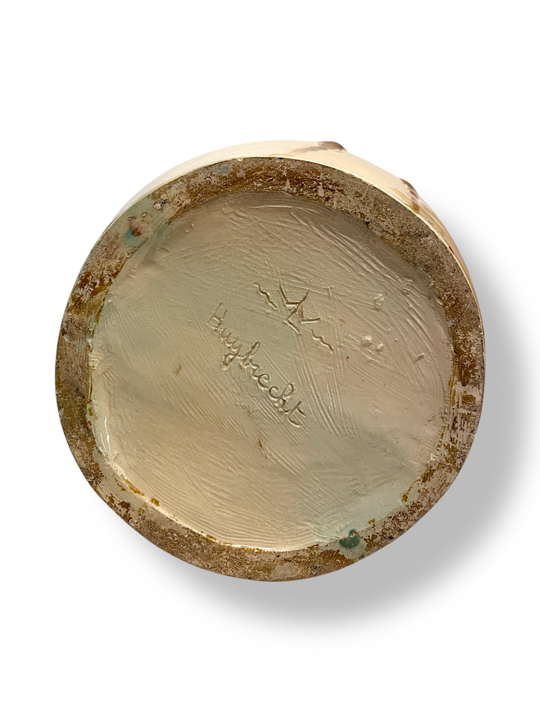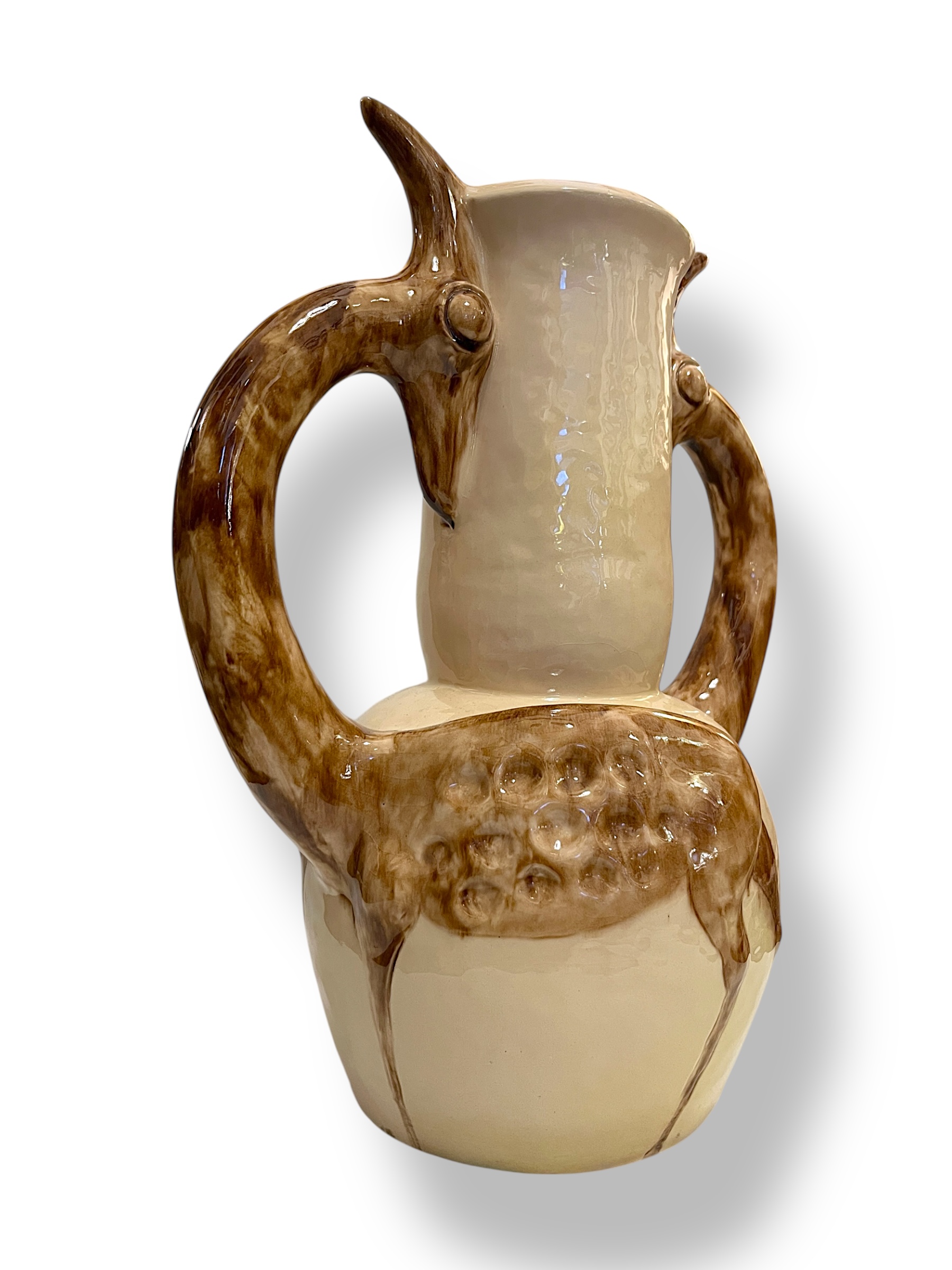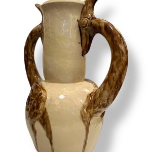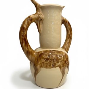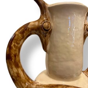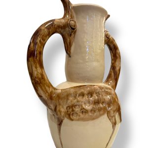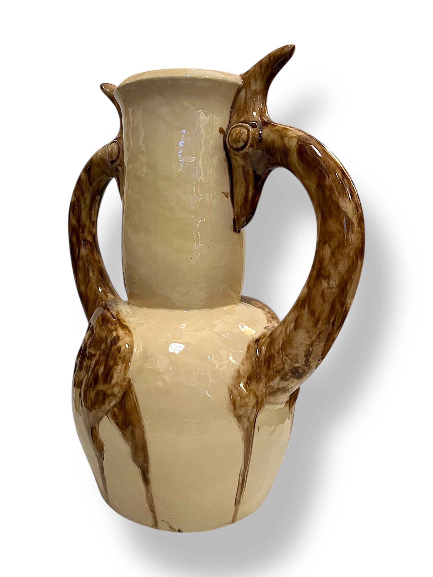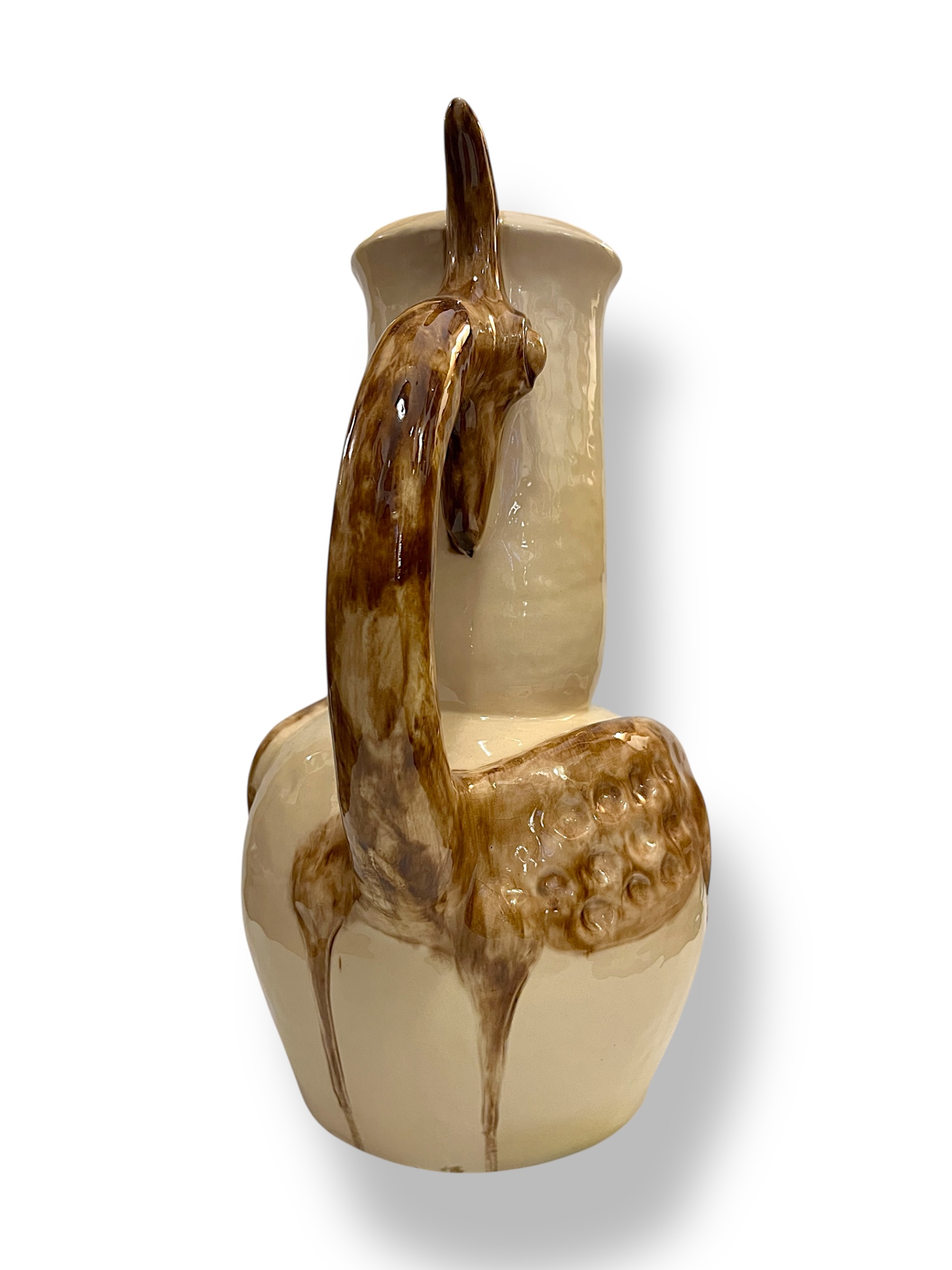 Vase en céramique émaillée beige, et marron, à haut col cylindrique, les anses figurant deux bouquetins par Huybrechts, Belgique, vers 1950.