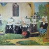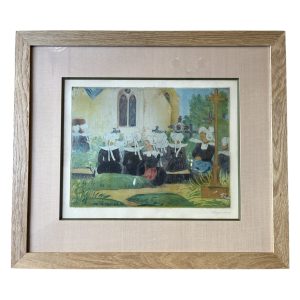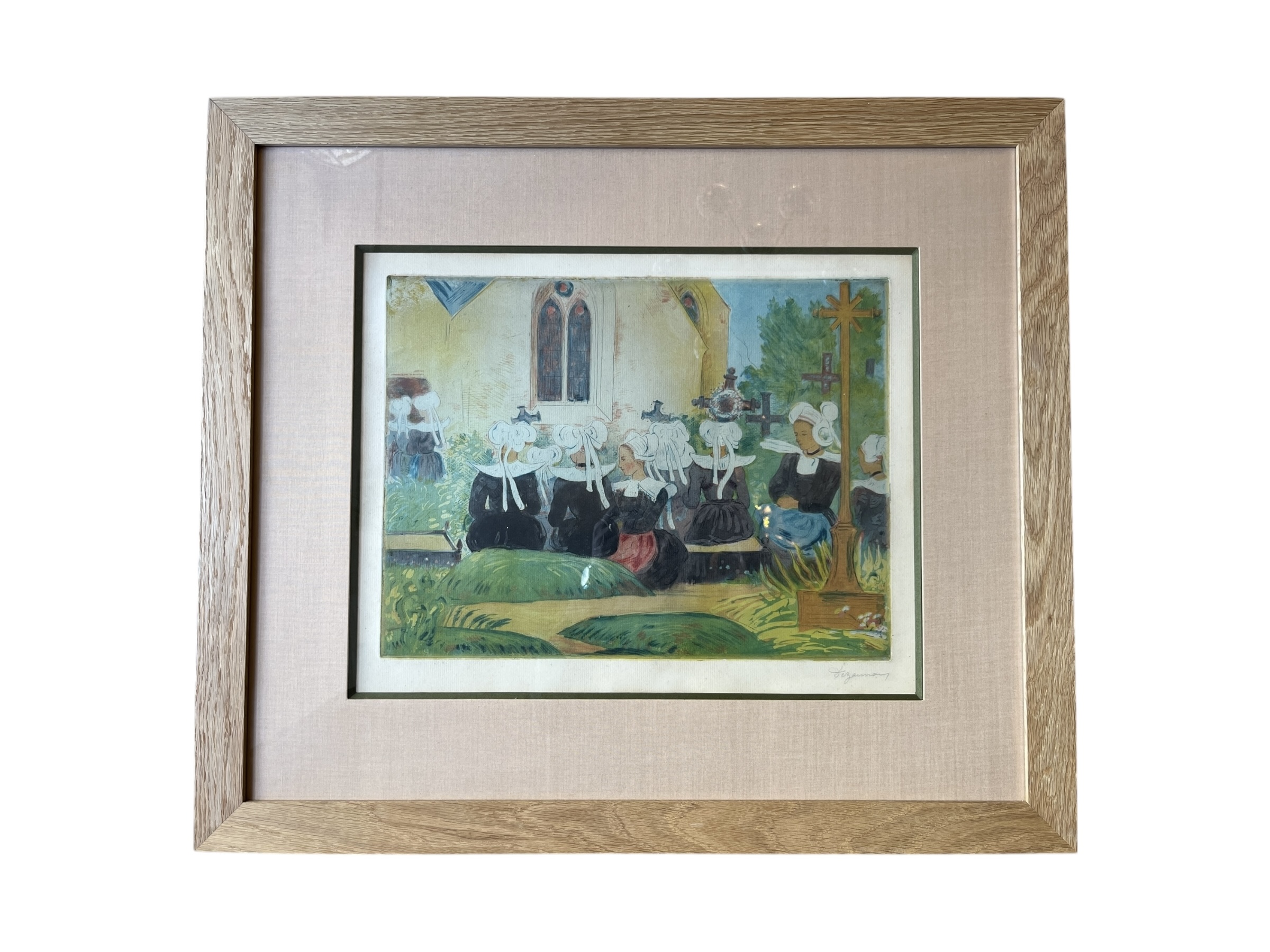 Eau-forte, groupe de femmes en costumes du dimanche devant une église. Toutes portent la coiffe « giz fouenn », mode de Fouesnant. ( 70x61cm avec cadre )