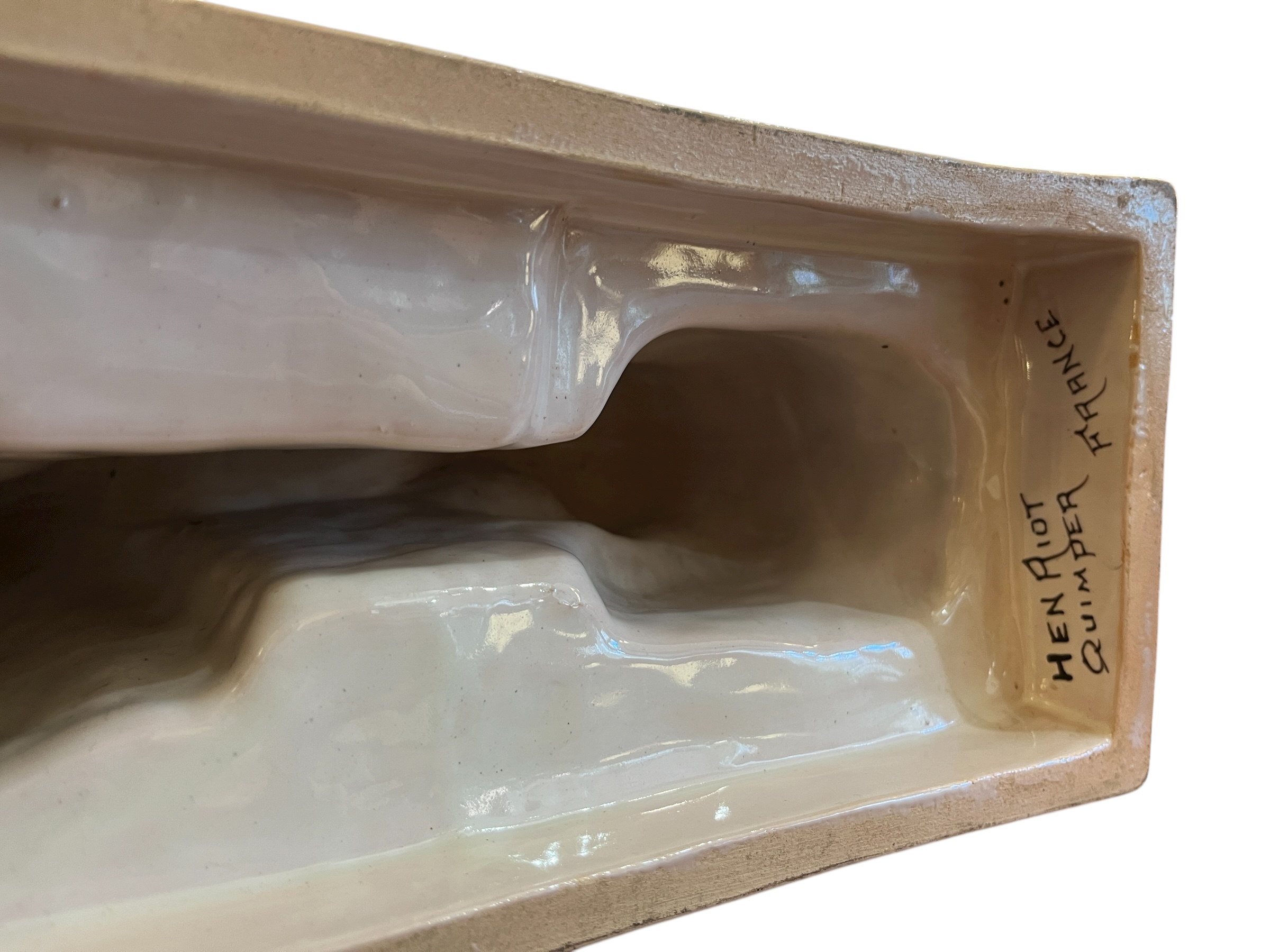 Signé du monogramme « E.J.B. » à l’arrière, et marque « HENRIOT QUIMPER FRANCE » sous la terrasse.